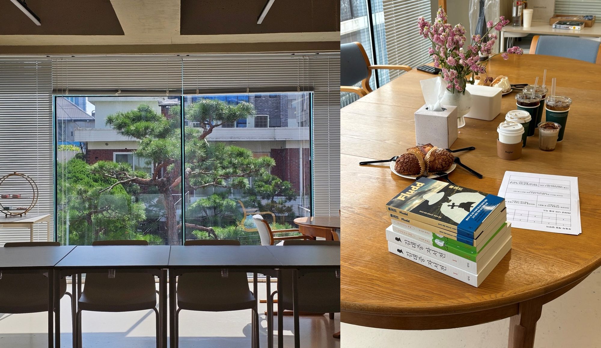 제가 프로그램을 아무리 잘 준비한들, 근사한 공간과 맛있는 음식을 이길 수 있을까요? 친구의 도움으로 홍대 근처에 멋진 공간을 빌렸습니다. 통창으로 햇살이 적당히 들어오고, 창 밖에는 (옆 집에서 심어놓은) 날렵하게 우람한 소나무가 보이는 곳입니다. 다행히 역에서도 5분 거리입니다.